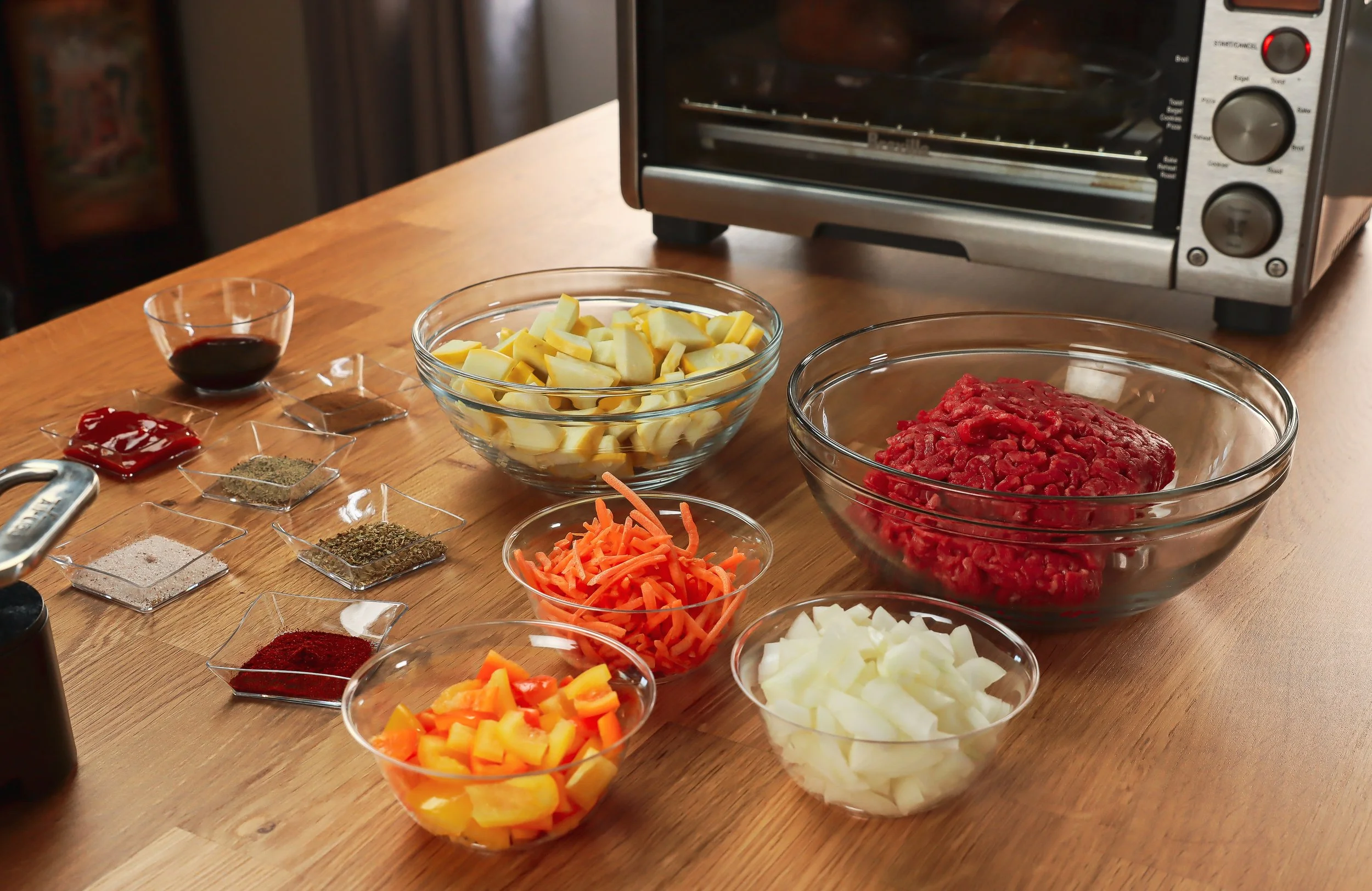 - En un tazón mediano, agregue su carne molida y todos los ingredientes de la "mezcla de especias", incluido el vinagre balsámico (ver arriba). Mezclar hasta que todo esté combinado.