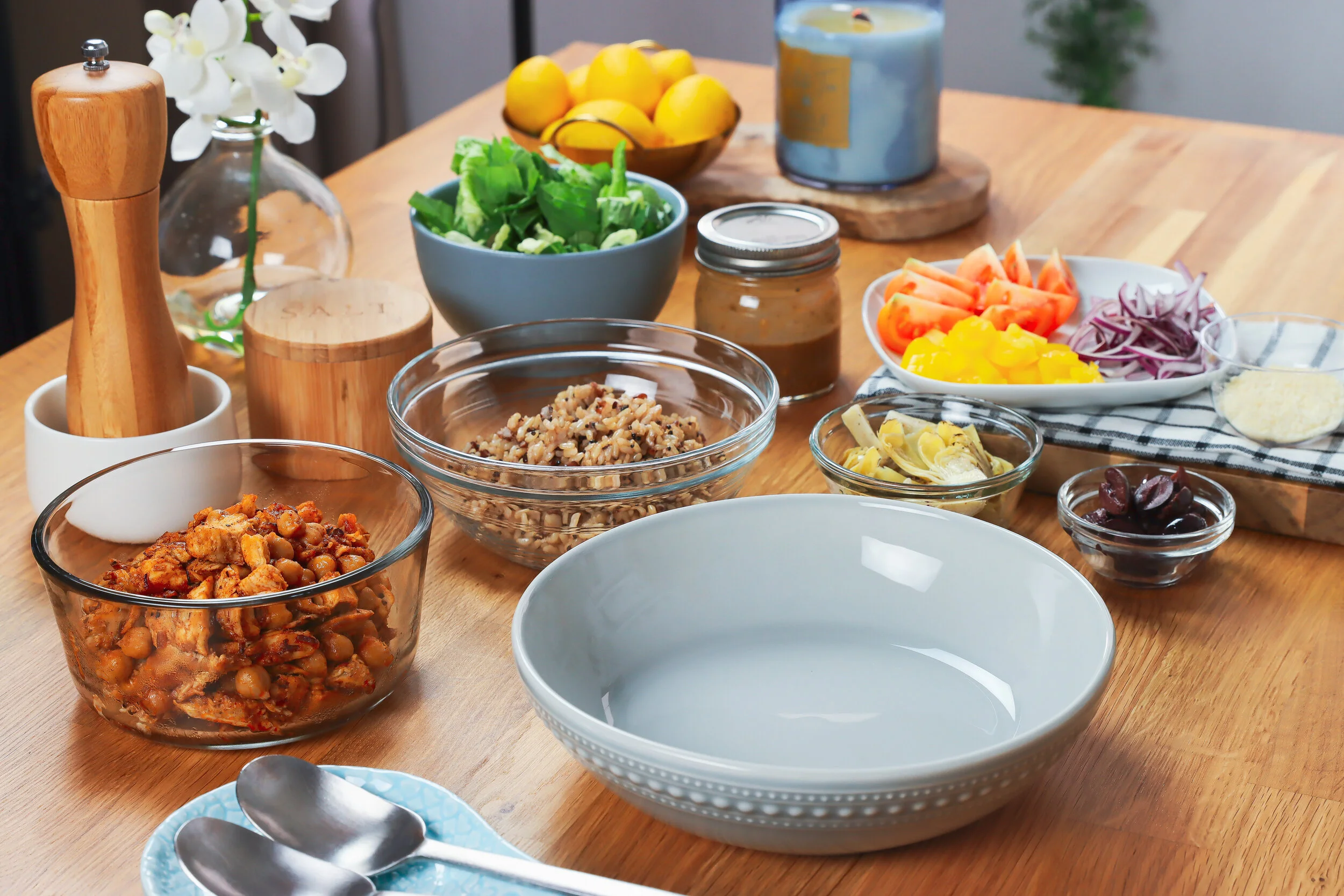 This quick 20-minute dinner is the perfect combo of chicken, chickpeas, fresh veggies, tart artichokes, olives and an easy homemade dijon balsamic dressing. Fresh ingredients, simple steps that make this the perfect semi-homemade dinner!