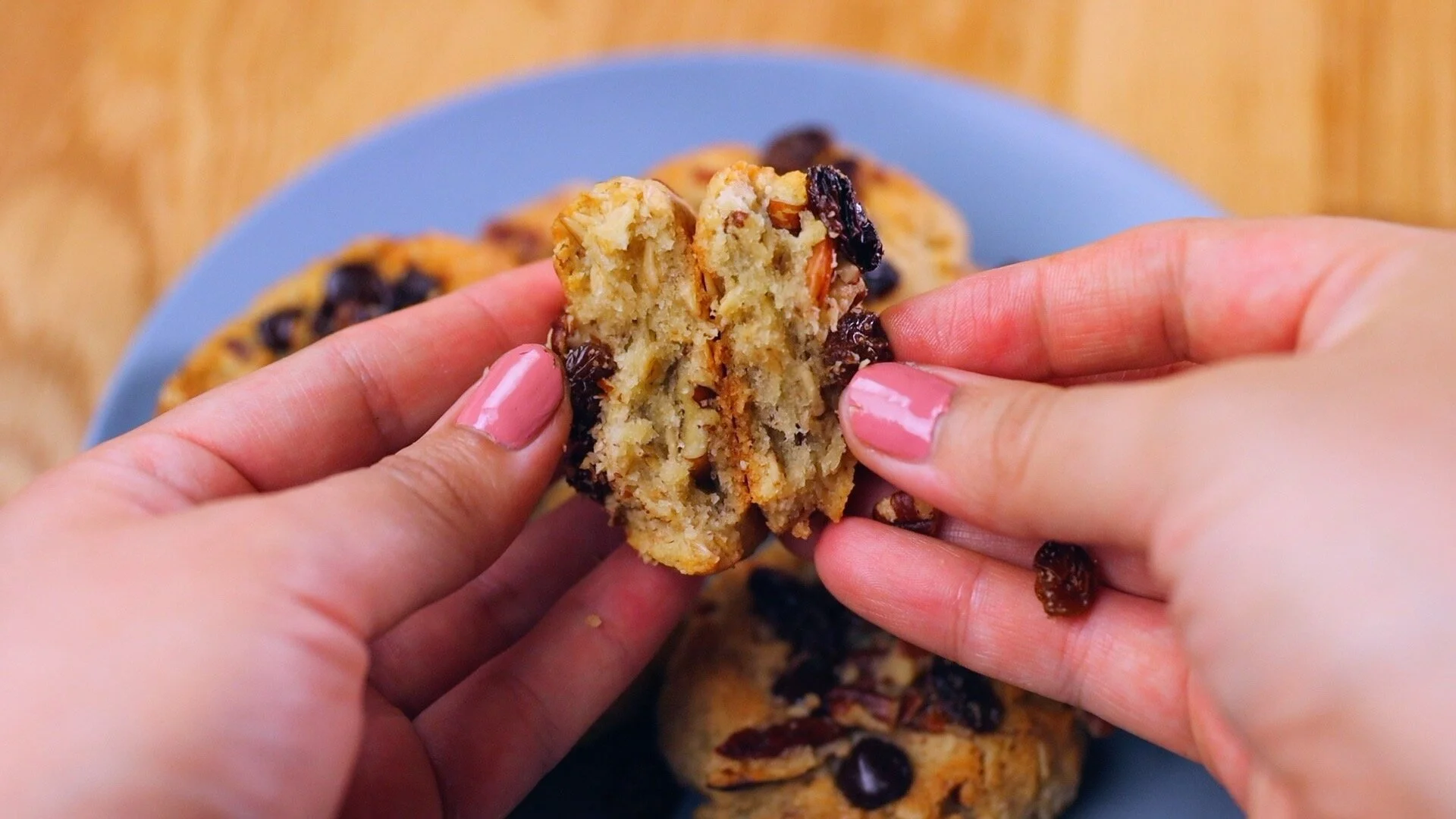 - Divide la masa en 8-9 bolas y colóquelas en la bandeja para hornear preparada. Si te sobraron nueces, avena o una mezcla de ambos, presiona la mezcla en la parte superior de las galletas para darle un toque decorativo agradable. Por último, aplana la parte superior de las galletas con los dedos con las coberturas sobrantes incluidas y dale forma a los bordes con los dedos una vez más.