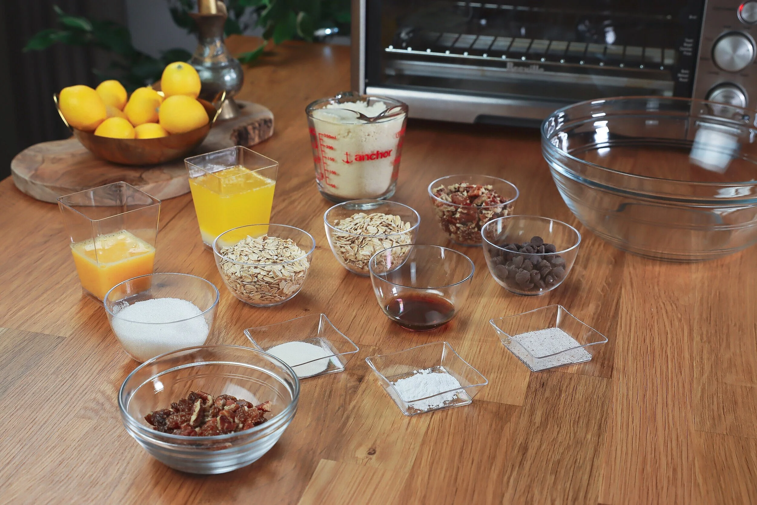 - En un tazón grande agregua la avena, la harina de almendras, nueces picadas, edulcorante, polvo de hornear, sal y el xanthan gum. Mezcla todos los ingredientes secos con una espátula.